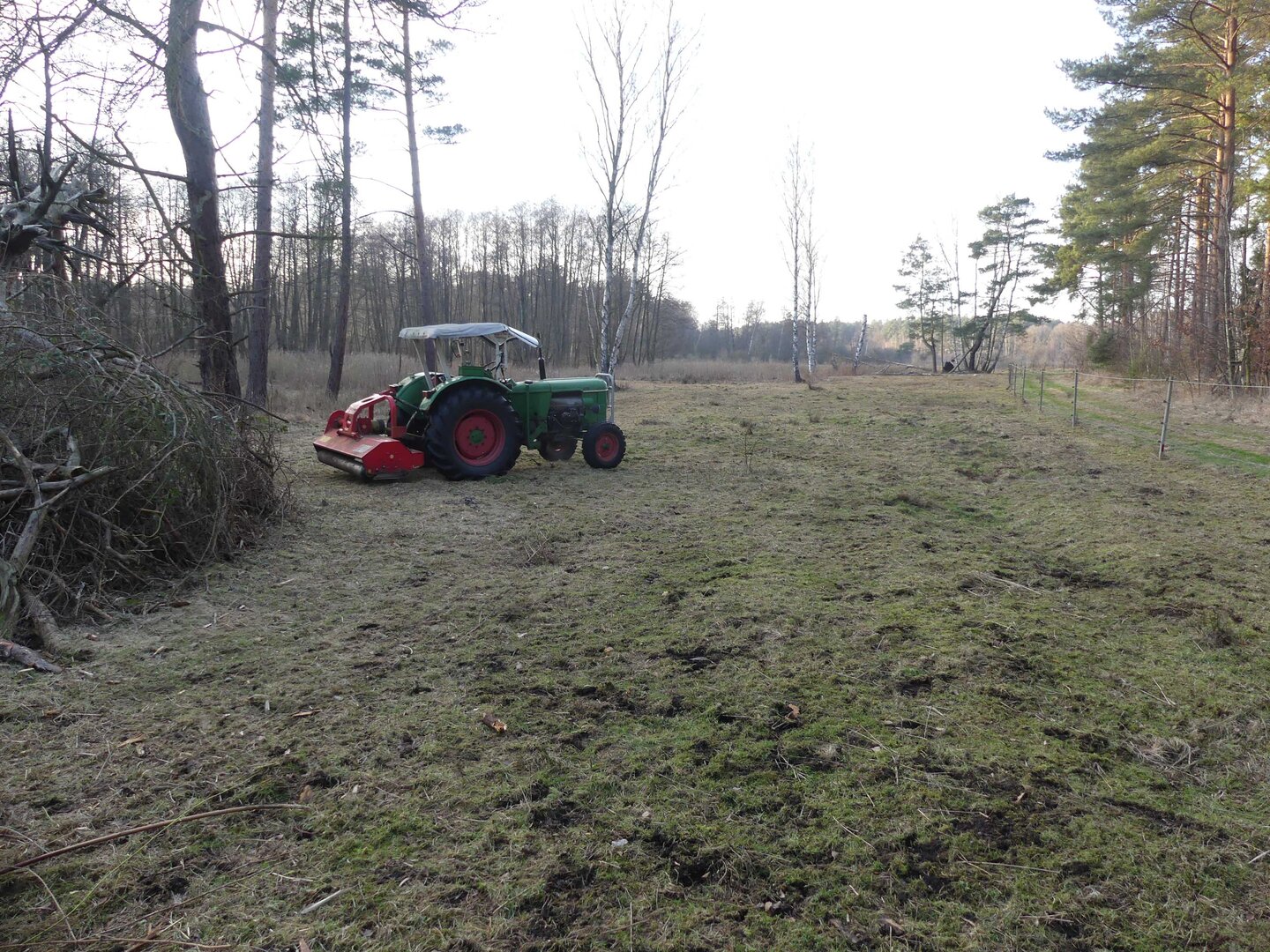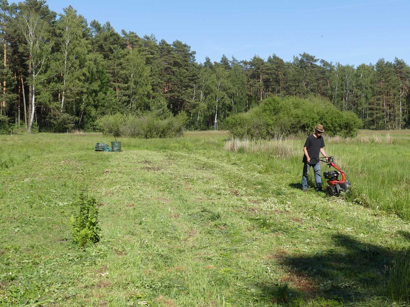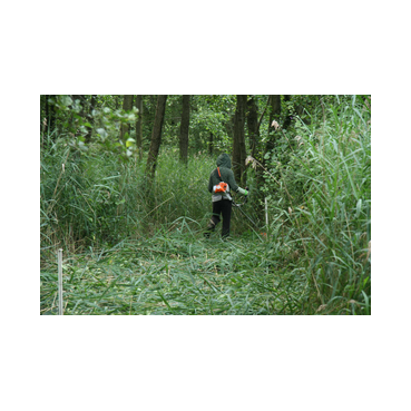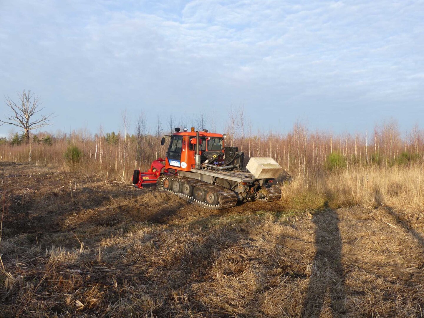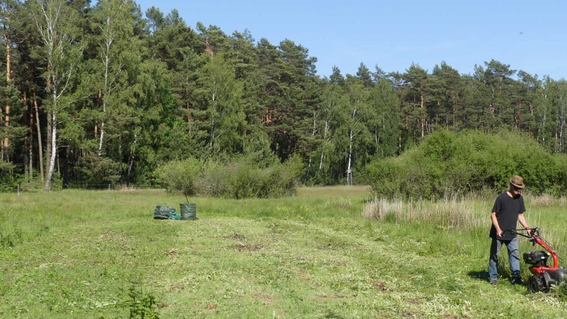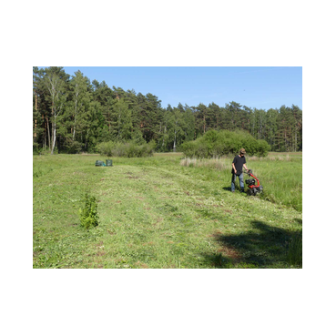 Um bestimmte Pflegeziele effektiv zu erreichen, müssen hin und wieder auch Maschinen eingesetzt werden. Und das natürlich schonend für die Flächen und ihre Bewohner. Auf den Lugenwiesen zum Beispiel gibt es viele Stellen, wo die neophytische Goldrute und stellenweise auch der Spierstrauch die heimische Vegetation verdrängt haben. Um ein Aussamen und damit weitere Ausbreitung zu verhindern, werden sie regelmäßig per Hand mit der Motorsense kurz vor der Blüte abgemäht. Im Daubaner Gehege wurden im Laufe der Jahre zahlreiche Heide- und Naßflächen entbuscht. Ihre großflächige Nachpflege erfordert außerhalb des Elchteiles eine spezielle Technik: wo der leichte Geländetraktor nicht mehr hinkommt, werden mit einer umgebauten Pistenraupe so im Winter jährlich bis zu 25 ha Kleingehölze in 'heftigstem' Gelände geschnitten.