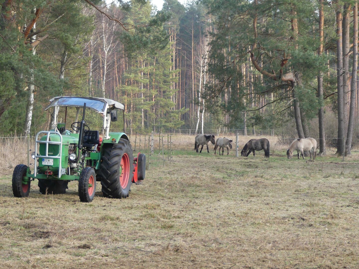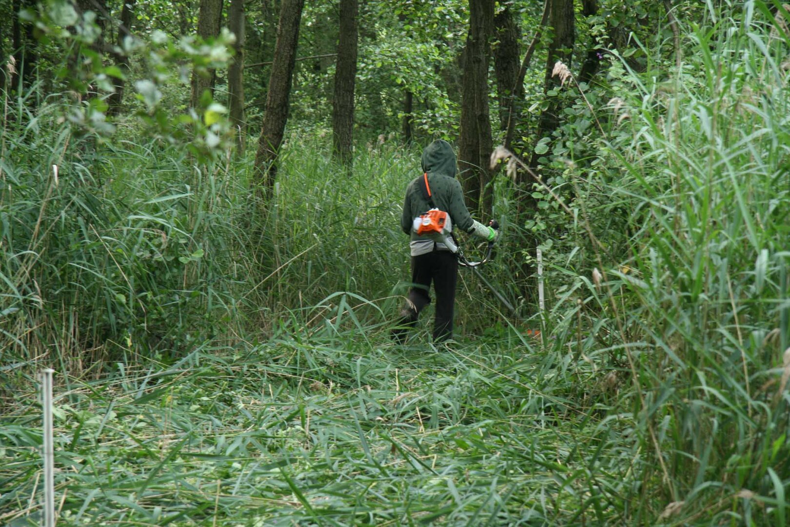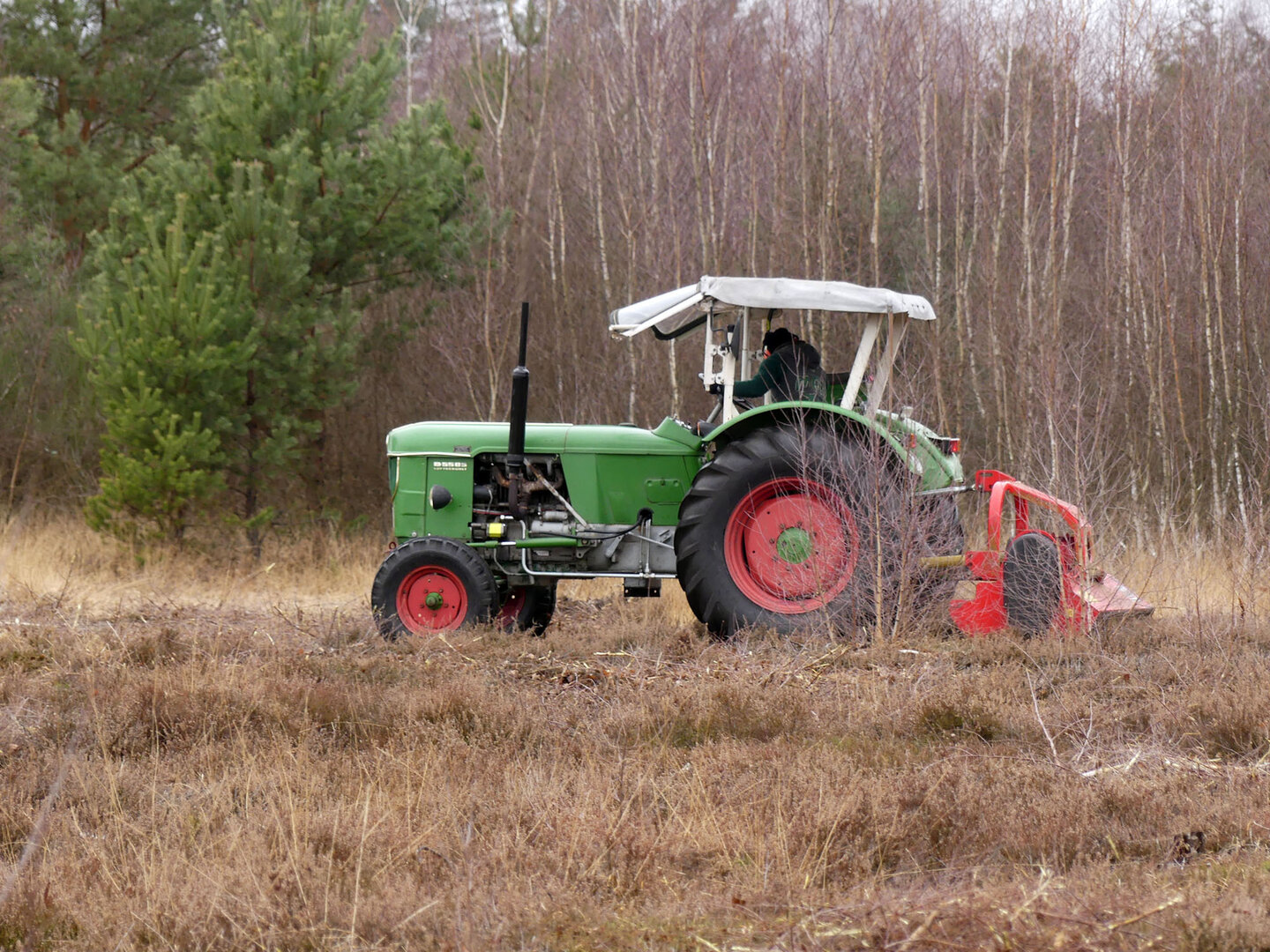 Um bestimmte Pflegeziele effektiv zu erreichen, müssen hin und wieder auch Maschinen eingesetzt werden. Und das natürlich schonend für die Flächen und ihre Bewohner. Auf den Lugenwiesen zum Beispiel gibt es viele Stellen, wo die neophytische Goldrute und stellenweise auch der Spierstrauch die heimische Vegetation verdrängt haben. Um ein Aussamen und damit weitere Ausbreitung zu verhindern, werden sie regelmäßig per Hand mit der Motorsense kurz vor der Blüte abgemäht. Im Daubaner Gehege wurden im Laufe der Jahre zahlreiche Heide- und Naßflächen entbuscht. Ihre großflächige Nachpflege erfordert außerhalb des Elchteiles eine spezielle Technik: wo der leichte Geländetraktor nicht mehr hinkommt, werden mit einer umgebauten Pistenraupe so im Winter jährlich bis zu 25 ha Kleingehölze in 'heftigstem' Gelände geschnitten.